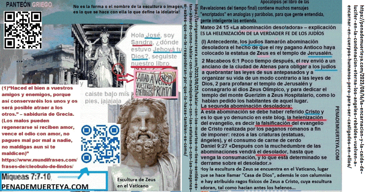 Y ellos dicen también que la verdad es su dios de cabello largo, ese dios Júpiter, el Zeus griego que proclaman con sus imágenes, lo hicieron a través de un evangelio falso que dice de él: «Yo soy la verdad, yo soy la puerta, adórenme a mi todos los dioses (Hebreos 1:6, Juan 14:16)». Era de suponer que esos asesinos odiaban la verdad y por eso engañando falsificaron sus mensajes, y siguiendo engañado dijeron: «Ya no perseguimos esa religión, ahora la difundimos.». Mi «OVNI» NTIEND.ME, emite luz. Esa luz destruye las calumnias del dragón o Satanás, cuyo nombre significa «el calumniador».