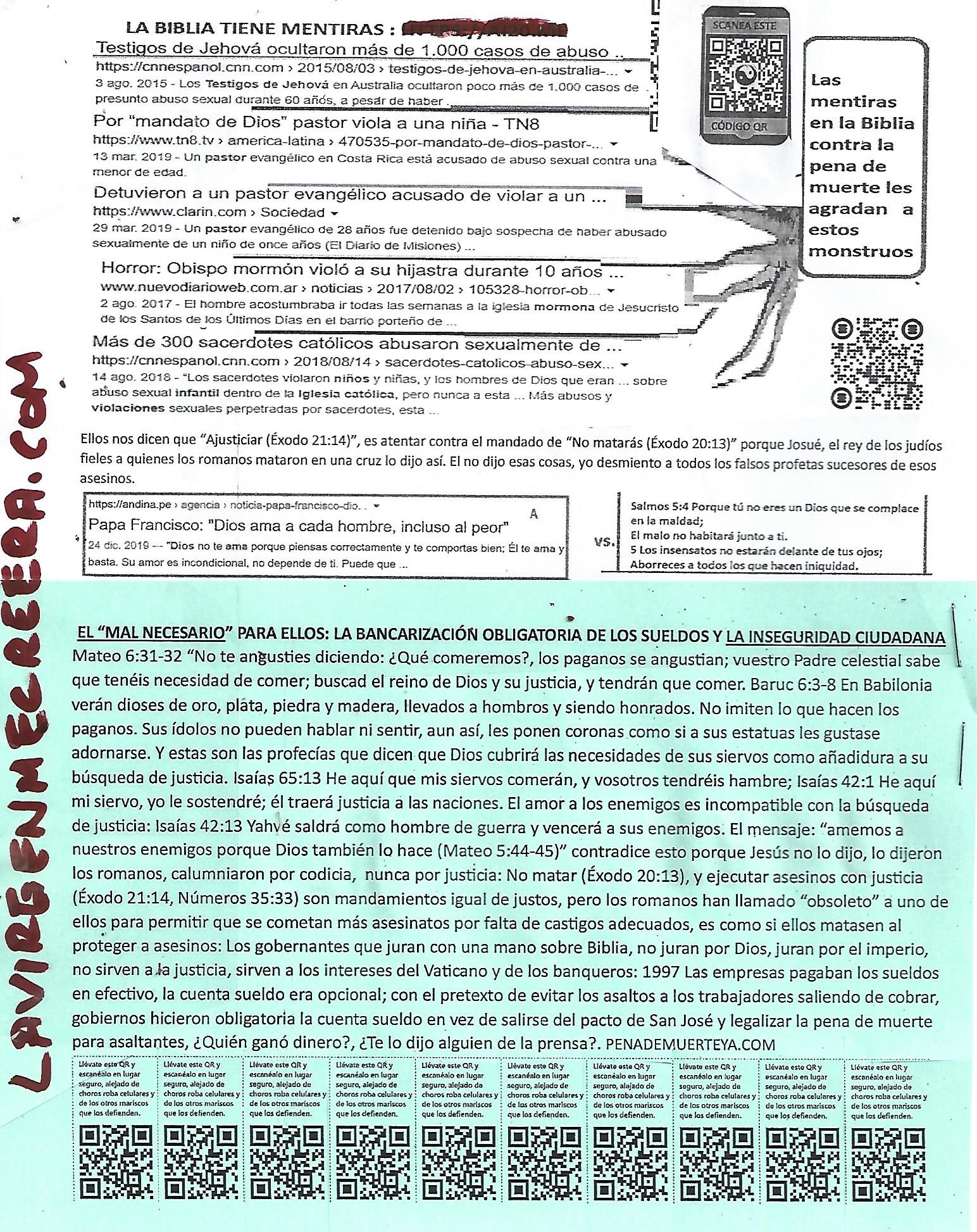 Apocalipsis 6:9 Cuando abrió el quinto sello, vi bajo el altar las almas de los que habían sido muertos por causa de la palabra de Dios y por el testimonio que tenían. 10 Y clamaban a gran voz, diciendo: ¿Hasta cuándo, Señor, santo y verdadero, no juzgas y vengas nuestra sangre en los que moran en la tierra? Los verdaderos mensajeros de Cristo y de su verdadero mensaje conocían las profecías y sabían que sus enemigos y perseguidores tenían en mente imponer el engaño mundial, pues conocían que la profecía en Daniel 8:25 debía tomar forma para que en el tiempo del fin, en el retorno de Cristo, el engaño sea destruido. En Apocalipsis 6:9-10, se está invocando entonces a que Dios cumpla sus promesas de justicia plasmadas en profecías como esta: Salmos 58:10 Se alegrará el justo cuando viere la venganza; Sus pies lavará en la sangre del impío. 11 Entonces dirá el hombre: Ciertamente hay galardón para el justo; Ciertamente hay Dios que juzga en la tierra. ¿Dónde está el amor a los enemigos en esta invocación a Dios y en estas profecías? En ningún lado. Jesús también sabía de antemano que los romanos nunca se iban a convertir a su religión y que destruirían sus mensajes y el de sus fieles testigos, por eso él dijo esto: Mateo 7:22 Muchos me dirán en aquel día: Señor, Señor, ¿no profetizamos en tu nombre, y en tu nombre echamos fuera demonios, y en tu nombre hicimos muchos milagros? 23 Y entonces les declararé: Nunca os conocí; apartaos de mí, hacedores de maldad. Así como el mensaje en Apocalipsis 6:9-10 es una alusión a la profecía en Salmos 58:6-11, este mensaje en Mateo 7:22-23 es una alusión a esta profecía donde es claro que él ama a Dios, pero odia a sus enemigos. Si él odia a sus enemigos y él no era hipócrita, entonces él nunca dijo el mensaje en Mateo 5:38-48. Fueron los hipócritas religiosos «católicos romanos», quienes con ese mensaje en la Biblia que dice «ama a tus enemigos», masacraron a mucha gente en nombre de su religión en la nada santa inquisición, que siempre estuvo a favor de los ídolos y no de la justicia, porque la estafa y la justicia son incompatibles: