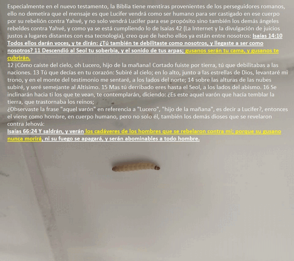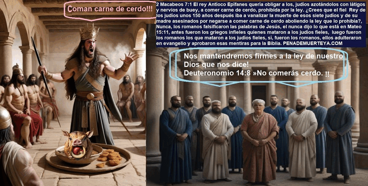 | 1 | Estás muy equivocado, defendiendo un evangelio helenizado por Roma, un evangelio que rechaza la ley de los alimentos prohibidos, y así estás insultando la sangre de los siete hermanos y de su madre quienes murieron por amor a esa ley (2 Macabeos 7, Deuteronomio 14), y quienes además al morir dijeron que por morir por las leyes de Dios, Dios los resucitará al final para heredar una vida eterna; Jesús fue asesinado por aquellas personas que odiaban su evangelio, así a como Antíoco IV Epífanes le desagradaba la ley judía en Levítico 11, no todos los que oyeron el verdadero evangelio se agradaron de ese evangelio, tan claro como que no todos se agradan de la ley en Deuteronomio 14, por eso los romanos lo adulteraron para hacerlo aceptable para más gente, pero al universalizar las religiones crearon una religión falsa; la muerte de Jesús fue a favor de otros justos, no a favor de la justificación de los malvados (Proverbios 17:15, Proverbios 29:27), contrario a lo que el fraude de los romanos dice en la Biblia (Mateo 15:11), los justos sí pecan, y es por el pecado de los justos, y únicamente de los justos; que no solo Jesús, sino también los otros hijos de Dios, dieron sus vidas por predicar, en medio de los dominios de un imperio idólatra como el imperio romano, el testimonio anti idolatría de la justicia (Salmos 82:6.7), los justos pecan cuando son ignorantes, los injustos pecan porque son injustos y nunca pueden dejar de ser así (Daniel 12:10), esa es la diferencia y no tiene sentido perdonar a un malvado (Números 35:33, Éxodo 21:14, Deuteronomio 13); cuando el justo conoce la verdad entonces ya deja de pecar, por eso en los Salmos 41, el varón traicionado confiesa haber pecado, pero al final Dios le concede su deseo, sabemos que Dios oye la plegaria de los justos y no la de los malvados, si ese pecador fuese injusto Dios nunca le hubiese perdonado ni concedido su deseo, en Miqueas 7, el pecador le desea mal a su enemiga, nada ahí cala con el amor a los enemigos, doctrina que es parte del falso evangelio. En Miqueas 7, el pecador dice que Dios le hará justicia y que el será su luz, eso demuestra claramente que los justos al estar en la oscuridad de la ignorancia pecan, es por este tipo de pecadores que Jesús dio su vida en la cruz, acá no se trata de decirle sí a toda calumnia romana en la Biblia para ser salvos. Isaías 66, Isaías 65 dejan en claro que incluso en el tiempo del fin, Dios sigue considerando inmunda la carne de cerdo, no es posible que Jesús haya dicho aquello en Mateo 15:11 citando incluso a Isaías para refutar a sus opositores. Son los justos al reencarnar los que hacen el juicio referido en Daniel 7:10, lo de la resurrección también es un invento romano, pues la parábola de los labradores malvados en Mateo 21:33-44 hace referencia a la profecía en Salmos 118:5-25, y los eventos alrededor del protagonista en esa profecía denotan que el comete errores, y que Dios lo castiga por tales errores, ¿por qué Dios castigaría a alguien sino porque ese alguien peca?, ¿Por qué pecaría Cristo si el ya conoce la verdad al volver en su mismo cuerpo luego de resucitar al tercer día y de subir al cielo?, porque sí murió (Salmos 22:16-18), pero no resucitó, cuando él vuelve no vuelve según el mito en Hechos 1, vuelve según la profecía en Oseas 6:1-3, en el tercer milenio desde su muerte (Salmos 90:4), junto con los otros santos que murieron por no adorar a la bestia ni a sus imagen ni llevar su marca en la frente ni en la mano (por no adoran a los paganos, a sus ídolos, ni pensar ni actuar como ellos, como en el caso de los siete hermanos y su madre, quienes no quisieron contaminarse comiendo carne de cerdo), ellos sin recuerdos pero para aprender y luego juzgar. Salmos 118 además demuestra que los sentimientos de Cristo no son de amor por los enemigos, Dios perdona a los que son dignos de perdón, solo a los justos, por eso Salmos 118:20 dice lo que dice, porque el justo sí puede pecar, en el juicio final son los justos los que tienen autoridad moral para juzgar, Ezequiel 23:24. El juicio se lleva a cabo en el cielo por los santos del Altísimo: ¿Sabes lo que es estar en “el cielo”?, estar en el cielo es estar con Dios para juzgar por medio de “la nube” pero la nube de la Internet (Isaías 42:1-4), y los que están con Dios para juzgar son los que en su vida pasada, antes de reencarnar, murieron sirviendo a Dios, los que fueron santos en sus vidas pasadas son los que están allí y ellos son los que juzgan ya, o los que juzgarán también cuando estén listos luego de volver a nacer, y de ser perfeccionados y purificados para hacer el juicio (y es en ellos se cumple la profecía: Salmos 118:7 Jehová está conmigo entre los que me ayudan; Por tanto, yo veré mi deseo en los que me aborrecen (Aquí no hay amor a los enemigos, sino odio mutuo)). En Daniel 7 se menciona que el cuerno hizo guerra contra los que moraban en el cielo y que por un tiempo los vencía: Daniel 7:21 Y veía yo que este cuerno hacía guerra contra los santos, y los vencía (Apocalipsis 13:7). El único modo que un santo al pecar sea vencido por el Diablo es que el nazca, pero ya no como santo, sino como un ignorante, ignorante pero justo (Salmos 14:5-7), un santo es un justo que conoce la verdad (Juan 17:17), y ellos ya la conocieron en sus vidas pasadas (Apocalipsis 10:7, Daniel 12:1, Apocalipsis 12:7), si alguien es justo pero ignorante de la verdad peca, es por eso que durante la ignorancia ellos, quienes en sus vidas pasadas fueron santos (Apocalipsis 20:4), son vencidos por el cuerno (el arrogante imperio romano hecho uno religioso). ¿Sabes lo que es estar en “el cielo”?, es cielo es estar con Dios, y los que están con Dios son los que en su vida pasada, antes de reencarnar, murieron sirviendo a Dios, los que fueron santos en sus vidas pasadas son los que están allí y ellos son los que juzgan o juzgarán cuando este listos luego de volv