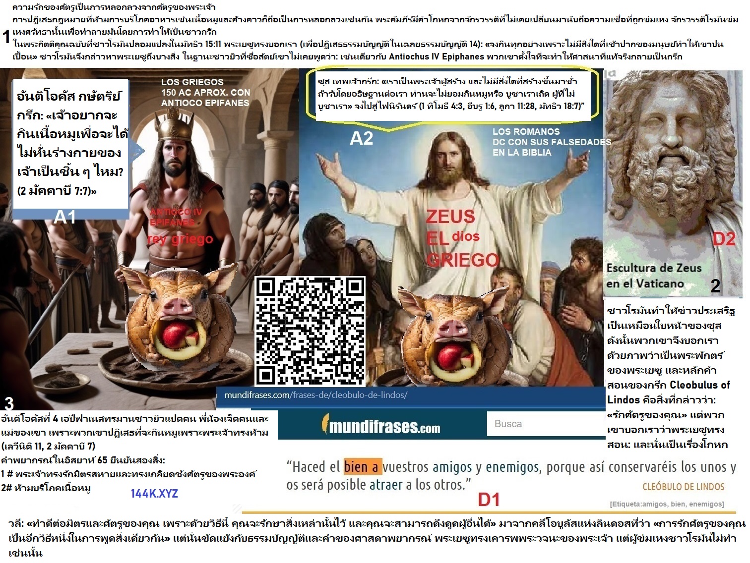 ซุส เทพเจ้ากรีก: “เราเป็นพระเจ้าผู้สร้าง และไม่มีสิ่งใดที่สร้างขึ้นมาชั่ว ถ้ารับโดยอธิษฐานต่อเรา ท่านจะไม่ยอมกินหมูหรือ บูชาเราเถิด ผู้ที่ไม่บูชาเรา” จงไปสู่ไฟนิรันดร์ (1 ทิโมธี 4:3, ฮีบรู 1:6, ลูกา 11:28, มัทธิว 18:7)”