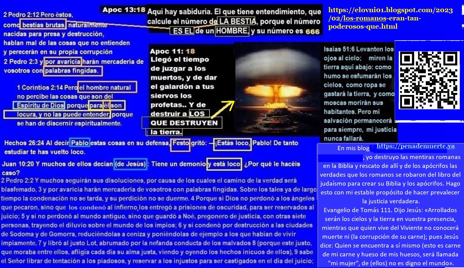 “El imperio Romano, Bahira, Mahoma, Jesús y el judaísmo perseguido. El nacimiento y la muerte de cuarta bestia. La alianza greco-romana por los mismos dioses. El Imperio seléucida. Cuidado con creer en el evangelio del anticristo (Buenas noticias para los injustos, aunque falsas) Si quieres salvarte del engaño del adversario de la justicia, considera que: Para rechazar el falso evangelio de Roma, acepte que si Jesús fue justo entonces no amó a sus enemigos, y si no fue hipócrita entonces no predicó el amor a los enemigos porque no predicaba lo que no practicaba: Proverbios 29:27 Los justos odian a los injustos, y los injustos odian a los justos. Esto es parte del evangelio adulterado por los romanos para la Biblia: 1 Pedro 3:18 Porque Cristo murió una vez por los pecados, el justo por los injustos, para llevarnos a Dios. Ahora mire esto que desmiente esa calumnia: Salmo 118:20 Esta es la puerta de Jehová; los justos entrarán por ella. 21 Te daré gracias porque me has escuchado y has sido mi salvación. 22 La piedra que rechazaron los constructores se ha convertido en la piedra angular. Jesús maldice a sus enemigos en la parábola que predice su muerte y regreso: Lucas 20:14 Pero cuando los viñadores vieron esto, discutieron entre sí, diciendo: Éste es el heredero; Venid, matémoslo, para que la herencia sea nuestra. 15 Entonces lo echaron de la viña y lo mataron. ¿Qué les hará entonces el dueño de la viña? 16 Él vendrá y destruirá a estos viñadores y dará la viña a otros. Cuando lo oyeron, dijeron: ¡De ninguna manera! 17 Pero Jesús, mirándolos, dijo: ¿Qué, pues, es esto que está escrito: La piedra que desecharon los constructores se ha convertido en la piedra angular? Él habló de esta piedra, de la piedra de la pesadilla del rey de Babilonia: Daniel 2:31 Tú, oh rey, veías, y he aquí una gran imagen. Esta imagen, que era muy grande, y cuya gloria era muy sublime, estaba en pie delante de ti, y su aspecto era terrible. 32 La cabeza de esta imagen era de oro fino; su pecho y sus brazos, de plata; su vientre y sus muslos, de bronce; 33 sus piernas, de hierro; sus pies, en parte de hierro y en parte de barro cocido. 34 Estabas mirando, hasta que una piedra fue cortada, no con mano, e hirió a la imagen en sus pies de hierro y de barro cocido, y los desmenuzó. 35 Entonces fueron desmenuzados también el hierro, el barro cocido, el bronce, la plata y el oro, y fueron como tamo de las eras del verano, y se los llevó el viento sin que de ellos quedara rastro alguno. Mas la piedra que hirió a la imagen fue hecha un gran monte que llenó toda la tierra. La cuarta bestia es la alianza de los líderes de todas las falsas religiones amigables con el fraude romano denunciado. El Cristianismo y el Islam dominan el mundo, la mayoría de los gobiernos o juran por el Corán o por la Biblia, por ese simple motivo, aunque los gobiernos lo nieguen, son gobiernos religiosos que se someten a las autoridades religiosas que están detrás de esos libros por los cuales juraron. Aquí les voy a mostrar la influencia romana en los dogmas de estas religiones y como distan mucho de los dogmas de la religión que perseguía Roma, Además, lo que les voy a mostrar no es parte de la religión que hoy se conoce como Judaísmo. Y si a esto le sumamos la fraternidad de los líderes del Judaísmo, Cristianismo e Islam, hay suficientes elementos para señalar a Roma como la creadora de los dogmas de estas religiones, y que la última religión mencionada no es la misma que el Judaísmo que perseguía Roma. Sí, estoy afirmando que Roma creó el cristianismo y que persiguió un Judaísmo diferente al actual, los líderes leales del Judaísmo legítimo jamás darían abrazos fraternales a difusores de doctrinas idólatras. Es evidente que no soy cristiano, ¿entonces porque cito pasajes de la Biblia para dar sustento a lo que digo?, pues porque no todo en la Biblia pertenece exclusivamente al cristianismo, parte de su contenido es el contenido de la religión del camino de la justicia que fue perseguido por el imperio romano por ser contrario al ideal romano de hacer que «Todos los caminos conduzcan a Roma (Es decir, que esos caminos favorezcan los intereses imperiales), por eso tomo algunos pasajes de la Biblia para sustentar mis afirmaciones. Daniel 2:40 Y el cuarto reino será fuerte como hierro; y como el hierro desmenuza y rompe todas las cosas, desmenuzará y quebrantará todo. 41 Y lo que viste de los pies y los dedos, en parte de barro cocido de alfarero y en parte de hierro, será un reino dividido; mas habrá en él algo de la fuerza del hierro, así como viste hierro mezclado con barro cocido. 42 Y por ser los dedos de los pies en parte de hierro y en parte de barro cocido, el reino será en parte fuerte, y en parte frágil. 43 Así como viste el hierro mezclado con barro, se mezclarán por medio de alianzas humanas; pero no se unirán el uno con el otro, como el hierro no se mezcla con el barro. 44 Y en los días de estos reyes el Dios del cielo levantará un reino que no será jamás destruido, ni será el reino dejado a otro pueblo; desmenuzará y consumirá a todos estos reinos, pero él permanecerá para siempre. El cuarto reino es el reino de las falsas religiones. Por eso a los Papas en el Vaticano le dan honores los dignatarios de países como Estados Unidos. El país líder en el mundo no es EEUU, no es la bandera de los Estados Unidos la que ondea en las plazas de armas de las capitales de varios países de Latino América, es la bandera del Vaticano la que ondea. Los Papas se reúnen con los líderes de otras religiones dominantes, cosa imposible de imaginar entre profetas y falsos profetas. Pero entre falsos profetas estas alianzas son posibles. La piedra angular es la justicia. Los romanos no sólo despreciaban el hecho de que fuera un hombre justo, sino también el hecho de que él merecía casarse con una mujer justa: 1 Corintios 11:7 La mujer es la gloria d