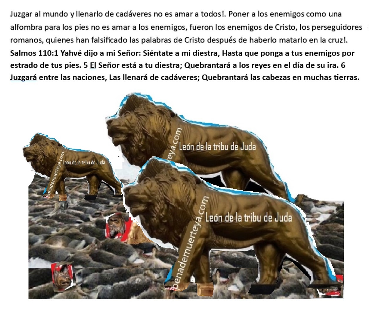 Yo hago lo que ellos harían (Apocalipsis 12:7), lucho contra los falsos testimonios contra Dios, y la Biblia incluye esos falsos testimonios, por eso Apocalipsis 12:9 dice lo que dice: la Biblia es parte de ese engaño mundial. Con estas palabras: Apocalipsis 22:18 Yo testifico a todo aquel que oye las palabras de la profecía de este libro: Si alguno añadiere a estas cosas, Dios traerá sobre él las plagas que están escritas en este libro. 19 Y si alguno quitare de las palabras del libro de esta profecía, Dios quitará su parte del libro de la vida, y de la santa ciudad y de las cosas que están escritas en este libro. Juan no se refería a la Biblia, la Biblia no existía, Juan se refería al verdadero evangelio que consistía en maldecir a los enemigos, no en bendecirlos como lo afirma la mentira en Mateo 5:38-48, precisamente por ello es que el maldice a los que el sabía que iban a adulterar las palabras incluso del libro de ese libro que el escribía, sin embargo ninguna mentira tiene solidez, ningún santo murió sintiendo amor por sus enemigos que los asesinaron, este pasaje lo evidencia: Apocalipsis 6:10 Y clamaban a alta voz diciendo: ¿Hasta cuándo, Señor, Santo y Verdadero, no juzgas y vengas nuestra sangre de los que moran en la tierra?. Dios es además vengativo, y ese pasaje lo deja en claro: Apocalipsis 16:5 Y oí al ángel de las aguas, que decía: Justo eres tú, oh Señor, el que eres y que eras, el Santo, porque has juzgado estas cosas. 6 Por cuanto derramaron la sangre de los santos y de los profetas, también tú les has dado a beber sangre; pues lo merecen. 7 También oí a otro, que desde el altar decía: Ciertamente, Señor Dios Todopoderoso, tus juicios son verdaderos y justos. El amor por los enemigos en base a un Dios que ama a sus enemigos es parte de las mentiras romanas en el evangelio.