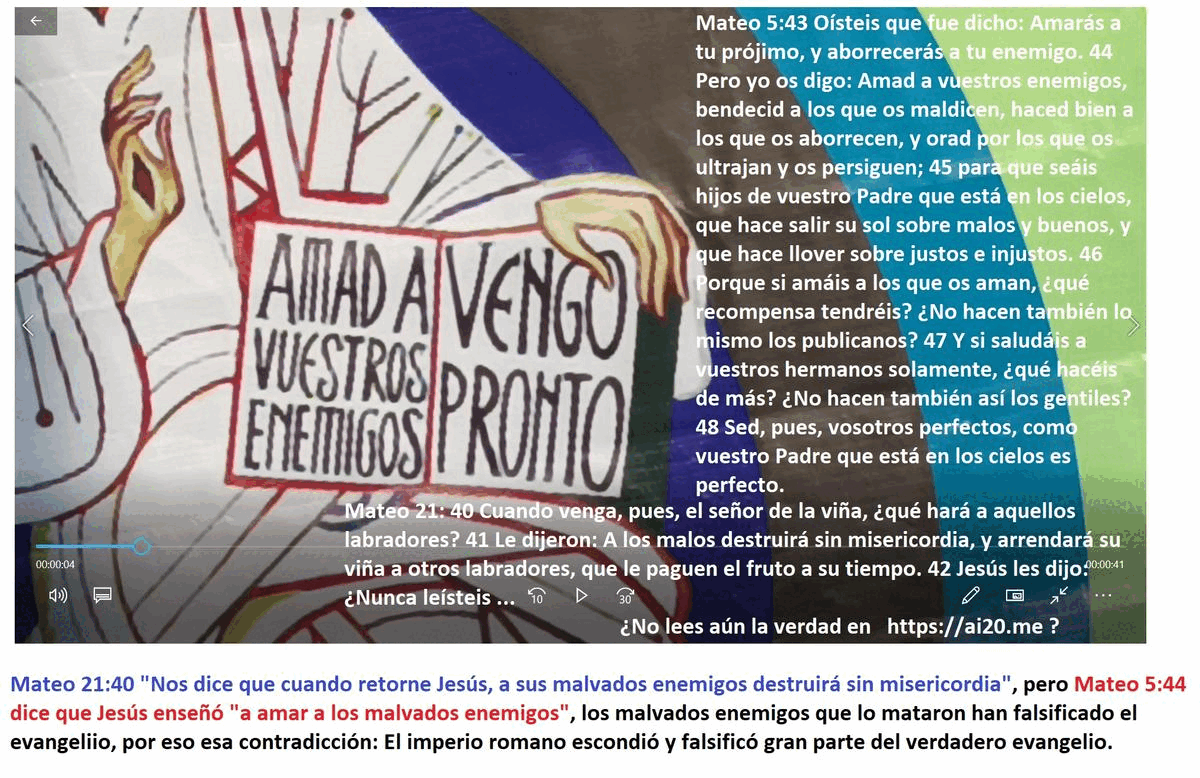 Esta contradicción no es síntoma de que tú, que desde allá me das la razón, y yo, no entendamos bien las escrituras como lo dirían los defensores de la Biblia, esto no es una “aparente contradicción», como ellos lo dirían. La contradicción es real y es síntoma de un fraude romano en la Biblia. No tiene sentido además que el santo Esteban se dirijan a una criatura y no a Dios en su última plegaria, pero ese es otro fraude que he quitado de Hechos 7 :58 para enfocarme en los sentimientos de los santos respecto a los que los mataron. Proverbios 29 :27 dice que los justos odian a los malos, la profecía en Salmos 58 :10 confirma esos sentimientos, contrastando Mateo 5 :38 con Apocalipsis 6 :9 se demuestra en base a la lógica, que la Biblia no merece el crédito que le dan muchos gobernantes de diversos países del mundo al jurar con su mano sobre la Biblia al asumir sus cargos públicos.