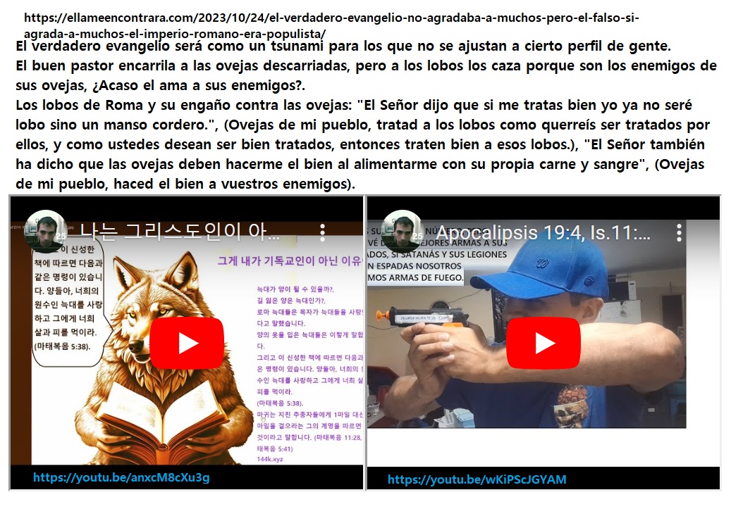 Amo a mi prójimo como a mi mismo, pero no todos son mi prójimo, mi prójimo son los justos, si todos fuesen el prójimo, nadie habría asesinado a los santos, ni nadie hubiese escondido sus palabras, ni nadie hubiese falsificado las palabras de los santos, ni yo tendría ninguna necesidad de hacer este juicio justo a favor de mi prójimo y en perjuicio de nuestros enemigos, pues nadie hubiese calumniado contra mi como lo hacen los enemigos de mi prójimo, es que no es lo mismo oveja que lobo, aunque la oveja este desorientada o descarriada por su ignorancia, oveja es y el pastor desea salvarla, en cambio el lobo, aunque se vista de oveja, lobo sigue siendo y no puede convertirse jamás en oveja, el buen pastor no solo apacienta a las ovejas, él tambien caza a los lobos, como lobos son los calumiadores, los lobos del imperio romano, que tienen por madre de los fundadores de Roma, no de casualidad, a una loba. Esos son los que han calumniado contra los santos, y ellos son los grandes perdedores en el juicio final, es que el juicio final no perjudica a todos ni beneficia a todos, por eso muchos conspiraron contra el juicio final pues saben por su asquerosa conciencia que lo que hacen es injusto. https://gabriels.work/2024/09/17/el-abogado-de-los-secuestradores-argumenta-con-argumentos-religiosos-no-exijan-lo-que-es-suyo-y-amen-a-sus-enemigos-lucas-1630-a-todo-el-que-te-pida-dale-y-al-que-tome-lo-que-es-tuyo-no-se-lo-r/