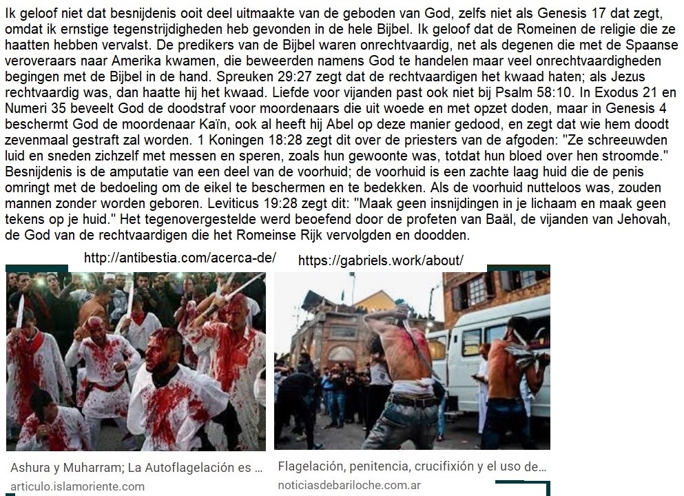 Besnijdenis in de Bijbel. Ik geloof niet dat de besnijdenis ooit deel uitmaakte van Gods geboden, ook al zegt Genesis 17 dat wel. Omdat ik door de hele Bijbel heen ernstige tegenstrijdigheden aantrof, geloof ik dat de Romeinen de religie die zij haatten vervalsten. De predikers van de Bijbel waren onrechtvaardig, net als degenen die met de Spaanse conquistadores naar Amerika kwamen, die beweerden in naam van God te handelen, maar veel onrecht begingen met de Bijbel in hun handen. Spreuken 29:27 zegt dat de rechtvaardigen het kwaad haten, als Jezus rechtvaardig was, dan haatte hij het kwaad, de liefde voor vijanden past ook niet in Psalm 58:10. In Exodus 21 en Numeri 35 gebiedt God de doodstraf voor moordenaars die met woede en intentie doden, maar in Genesis 4 beschermt God de moordenaar Kaïn, ook al doodde hij Abel op deze manier, door te zeggen dat degene die hem doodt zeven keer zal worden gestraft, 1 Koningen 18:28 vertelt dit over de priesters van de afgoden: “Zij riepen met luide stemmen en sneden zichzelf met messen totdat het bloed over hen vloeide.” Besnijdenis is het amputeren van een deel van de voorhuid, de voorhuid is een zachte huidlaag die de penis omringt met de bedoeling de eikel te beschermen en te bedekken. Als de voorhuid nutteloos zou zijn, zouden mannen zonder voorhuid geboren worden. Leviticus 19:28 zegt dit: “Gij mag geen snijwonden in uw lichaam maken, noch vlekken op uw huid afdrukken.” Het tegenovergestelde werd in praktijk gebracht door de profeten van Baäl, de vijanden van Jehova, de God van de rechtvaardigen die door het Romeinse Rijk werden vervolgd en gedood.