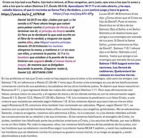 Gabriel: «Vete falso Cristo, vete Satanás, conozco tus intenciones, solo quieres estar cerca de los niños porque formas parte de una mafia internacional de pedófilos que abogan por la impunidad de sus actos despreciables, mintiendo con el cuento de que el amor al enemigo es una orden de Dios, pero yo te he quitado la máscara en mi blog, bestiadn.com. No acepto propaganda de católicos, ni protestantes, ni mormones, ni evangélicos, ni de los que se dicen «testigos de Jehová», ni de ningún grupo que predique tu Biblia, que dicta una rebelión contra la justa ley de Dios, la ley del talión! Una rebelión que el verdadero Cristo jamás predicó, aunque así lo afirmes, porque eres Satanás, tu nombre lo dice «Eres un calumniador», inventas pecados y pecadores donde no los hay para tener gente sumisa a tus normas arbitrarias con las que buscas el lucro y la oportunidad de estar cerca de los hijos, tal como lo hace tu pueblo religioso porque son tus hijos, no son mi pueblo, mi pueblo es Lot, mi pueblo es Noé, mi pueblo no son los abominables enemigos de Lot y Noé, a todos esos abominables enemigos de los justos les digo Mateo 25:41 «Apartaos de mí, malditos, id al fuego eterno preparado para el diablo y sus ángeles.» En mí no hay mentira, ni incoherencia, porque predico el odio a los enemigos y el amor a los amigos.