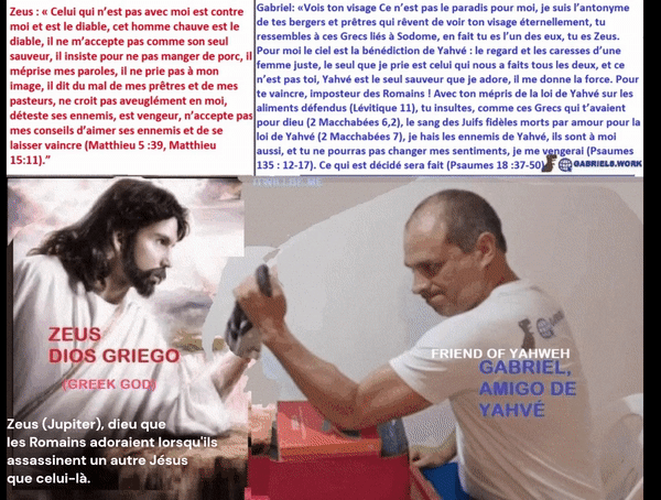 Gabriel : « Va-t’en faux Christ, va Satan, je connais tes intentions, tu ne veux être proche que des enfants parce que tu fais partie d’une mafia internationale de pédophiles qui prônent l’impunité pour leurs actes méprisables, mentant avec l’histoire que l’amour pour l’ennemi est un ordre de Dieu, mais j’ai enlevé ton masque dans mon blog, bestiadn.com. Je n’accepte pas la propagande des catholiques, ou des protestants, ou des mormons, ou des évangéliques, ou de ceux qui se font appeler « Témoins de Jéhovah », ou de tout groupe qui prêche ta Bible, qui dicte une rébellion contre la juste loi de Dieu, la loi du talion ! Une rébellion que le vrai Christ n’a jamais prêchée, même si tu le prétends, car tu es Satan, ton nom le dit « Tu es un calomniateur », tu inventes des péchés et des pécheurs là où il n’y en a pas pour avoir des gens soumis à tes règles arbitraires avec lesquelles tu cherches le profit et l’opportunité d’être proche des enfants, tout comme le font tes religieux parce qu’ils sont tes enfants, ils ne sont pas mon peuple, mon peuple est Lot, mon peuple est Noé, mon peuple ne sont pas les abominables ennemis de Lot et Noé, à tous ces abominables ennemis des justes je dis Matthieu 25:41 « Éloignez-vous de moi, maudits, allez dans le feu éternel préparé pour le diable et ses anges. » En moi, il n’y a ni mensonge, ni incohérence, car je prêche la haine des ennemis et l’amour des amis.