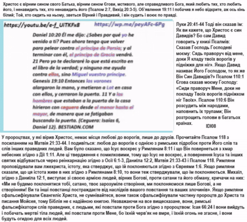 ЛжеХристос: Впусти тих, хто проповідує любов до ворогів! і благословення тих, хто їх проклинає! Інакше ти будеш моїм ворогом, і я не благословлю тебе, і ти будеш серед тих, кому я скажу в день суду. Від Матвія 25:41 «Ідіть від Мене, прокляті, ідіть у вогонь вічний, уготований для диявола та його ангелів.
