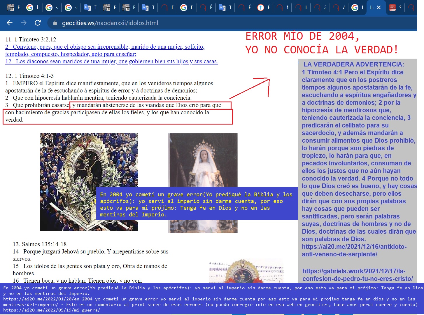 Lo que predican es un mensaje incompatible con los intereses de los verdaderos santos. Por eso, esta es mi penitencia por ese pecado involuntario. Al negar una falsa religión, las niego todas. Y cuando termine de hacer mi penitencia, entonces Dios me perdonará y me bendecirá con ella, con esa mujer especial que necesito. Porque, aunque no creo en toda la Biblia, sí creo en lo que me parece correcto y coherente en ella; el resto es calumnia de los romanos.