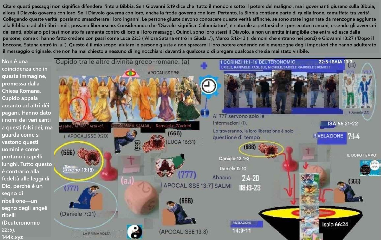 E dicono anche che la verità è il loro dio dai capelli lunghi, quel dio Giove, lo Zeus greco che proclamano con le loro immagini, lo hanno fatto attraverso un falso vangelo che dice di lui: «Io sono la verità, io sono la porta, adoratemi tutti voi dèi (Ebrei 1:6, Giovanni 14:16)». Era da supporre che quegli assassini odiassero la verità e per questo hanno ingannato e falsificato i veri messaggi, e hanno continuato a ingannare dicendo: «Non perseguitiamo più quella religione, ora la diffondiamo». Il mio «UFO» NTIEND.ME, emette luce. Quella luce distrugge le calunnie del drago o Satana, il cui nome significa «il calunniatore».