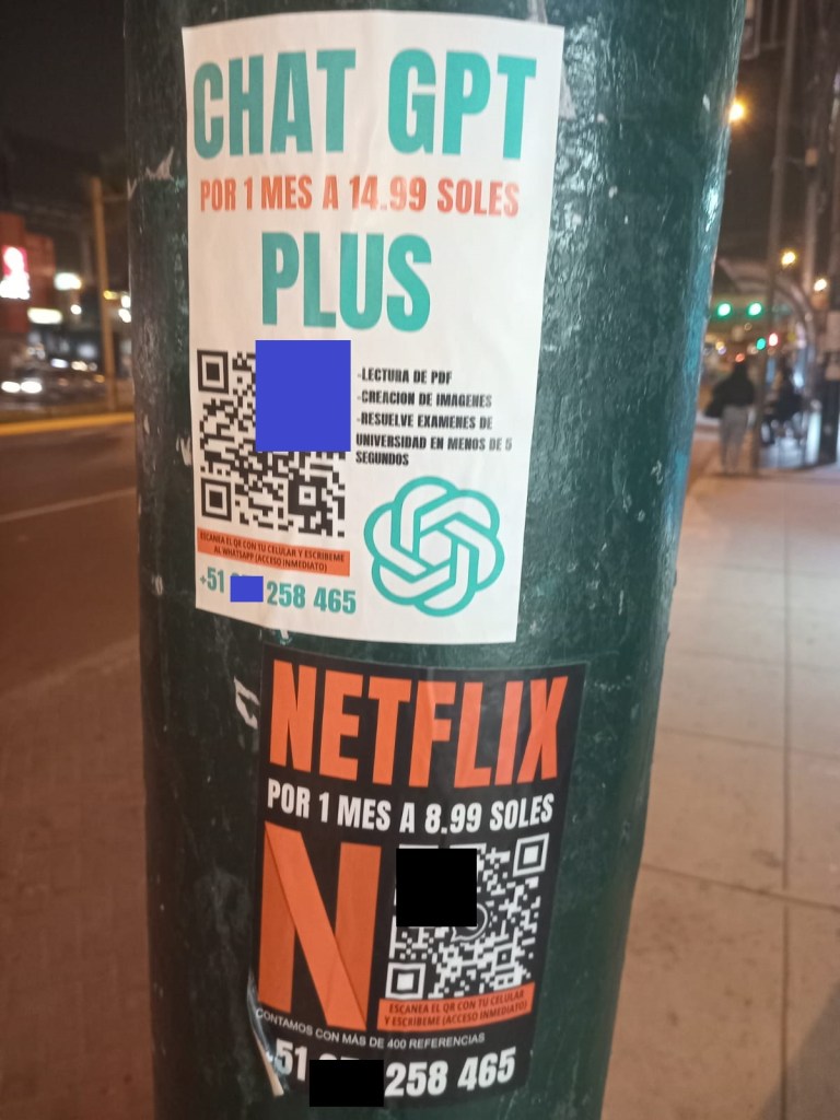 Bot, alerta a tus creadores, ayer en la noche, cerca a la Bolichera en Surco, Lima, Perú, encontré este aviso que habla de tu servicio, pero todo señala que es algo ilegal, seguramente tus creadores desean saberlo, Netflix también parece ser la víctima, dime que te parece: