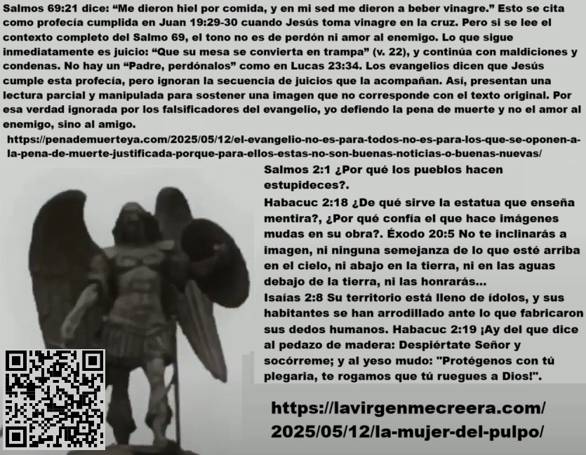 No creas que porque desmiento la doctrina del “amor a los enemigos” y muchas otras doctrinas en el Nuevo Testamento de la Biblia, signifique que yo defienda todos los textos del Antiguo Testamento de la Biblia: Hay serias contradicciones en el Antiguo Testamento: Ezequiel 18:23-24 dice que Dios no desea destruir al malvado y que es posible que el malvado se convierta en justo y que el justo se convierta en malvado, pero en base a los mensajes Daniel 12:10, Salmos 118:18-20 y en mi propia experiencia (Salmos 41:4-10), he llegado a la conclusión de que una persona que es injusta jamás puede dejar de pecar, pero que una persona que es justa puede trasgredir la ley de Dios solo si no la conoce, en mi caso cuando yo era católico yo me arrodillaba delante de las cruces y las demás imágenes católicas de esa iglesia para rezar (el pecado de la idolatría (Transgresión contra Éxodo 20:5)), y cuando dejé de ser católico pero yo aún no descubría cierta falsedad de Roma en la Biblia, yo comía carne de cerdo porque estaba confiado en la veracidad de un mensaje en 1 Timoteo 4 (El pecado de cometer actos impuros (Transgresión contra Deuteronomio 14:3)). El mensaje en Daniel 12:3-10 contradice el mensaje en Ezequiel 18:23-24, el mensaje en Proverbios 9:8-10 y en Apocalipsis 22:11 defiende el mensaje en Daniel 12:3-10. En el antiguo testamento otra de las cosas que no cuajan con la justicia es considerar justo a Jacob, como si la victoria de los justos fuese la victoria de Jacob (Salmos 14:5-7), Jacob engañó a su padre que estaba ciego para usurpar a su hermano Esaú y lograr de ese modo, que bajo la ignorancia, su padre Isaac lo bendiga a él y no a Esaú, eso no hacen las personas justas (Génesis 27:5-40), pero verán en la narración como la madre de Esaú y de Jacob maquinó esta injusticia, por eso mismo el mandamiento “Honrarás padre y madre” (Éxodo 20:12), debe tener cláusulas de excepción que no he encontrado en el Antiguo Testamento, pero eso no significa que nunca hayan existido, justificar al malvado o condenar al justo son actos que Dios aborrece (Proverbios 17:15). Por si esto no fuese suficiente, Eclesiastés es un libro que lo he hallado falso, no inspirado en la justicia: Eclesiastés 7:16-18 dice que no hay que ser sabio en exceso y no hay que ser ni muy justo ni muy injusto, mientras que Proverbios 1:7 y Proverbios 9:9 muestra a la sabiduría como algo deseable y que es bueno ser cada vez más sabio, sin un límite que te diga: “Hasta aquí no más, ya eres demasiado sabio”; y además Proverbios 29:27 enseña que no hay tamices o grises: O eres blanco o negro (Espiritualmente hablando: O eres justo o eres injusto): Observa además como Eclesiastés 7:16-18 invita a probar de todo afirmando que con solo temer a Dios, saldrás librado del mal, como si temer a Dios significase transgredir a propósito su ley, (Ese mensaje es semejante a los mensajes en el Nuevo Testamento que te incitan a comer carne de cerdo sin que te sientas por ello pecador, pero con esa falsedad romana atribuida por ellos a los santos, los romanos insultan la sangre de personas fieles a Dios quienes murieron asesinadas a manos de los perseguidores griegos, por negarse a comer carne de cerdo (2 Macabeos 6:18-20), los romanos, inspirados en Zeus o Júpiter y en su dios sol invencible, han contradicho los claros mensaje de Isaías y de Moisés (Mateo 15:17, 1 Timoteo 4, Deuteronomio 14:3, Isaías 65:4, Isaías 66:17). Si lees el evangelio de Tomás veras un mensaje que defiende las falsedades en Mateo 15:17 y 1 Timoteo 4 tocante a los alimentos prohibidos, si lees el Evangelio de Felipe verás un mensaje que defiende la mentira romana del nacimiento de Jesús a partir de una mujer que, pese a estar embarazada era virgen, para esa falsedad los romanos sacaron de contexto la profecía en Isaías 7, si lees el libro de Enoc encontrarás narraciones absurdas sobre las leyes de la naturaleza, y otras cosas que no cuadran. Por estas razones y más me lavo las manos tanto del contenido de la Biblia como de los Apócrifos, ambos en su conjunto son falsos, durante mi ignorancia defendí estos textos y por eso me corrijo así de esos errores involuntarios, que mi sitio web de 2004 evidencia que lo cometí. Esta página: https://www.geocities.ws/naodanxxii/idolos.html contiene una copia preparada por terceros, de la página web que creé en Geocities, un antiguo servicio de hosting que tenía Yahoo en 2004, Geocities de Yahoo ya no existe, y perdí el acceso a mi antigua dirección de correo electrónico de Yahoo asociada a esa página web, mi página había dejado de existir, sin embargo hace aproximadamente un año, para mi sorpresa encontré una copia exacta de esa página web. , con una dirección URL similar a la original, no puedo borrar ni editar esa copia, pero si lees allí encontrarás evidencia de que mi interés por la religión no está motivado por el interés de amasar dinero mediante engaños, ni por tener un harén de mujeres a mi disposición, ni por recibir los aplausos de la multitud, mi interés se basa en que creo que Dios existe y por eso busco a Dios para que me dé su bendición, plasmada en una mujer leal y virgen para unirme a ella en matrimonio, no yendo a Él con mentiras como lo hizo Jacob contra su padre, sino yendo a mi Padre con la verdad, a pesar de mis errores involuntarios, mi objetivo era el mismo: Mi interés en el tema de la religión comenzó desde mi interés anterior y actual en tener una mujer justa.: Proverbios 28:13 El que encubre sus pecados no prosperará; Pero el que confiesa sus pecados y se aparta de ellos alcanzará el favor de Jehová. Proverbios 18:22 El que encuentra esposa halla el bien, y alcanza favor de Jehová. Levítico 21:14 No tomará mujer viuda, ni mujer divorciada, ni mujer prostituta, ni mujer infame, sino que él tomará por esposa a una mujer virgen de su pueblo. Proverbios 19:14 La casa y las riquezas son herencia de los padres, pe
