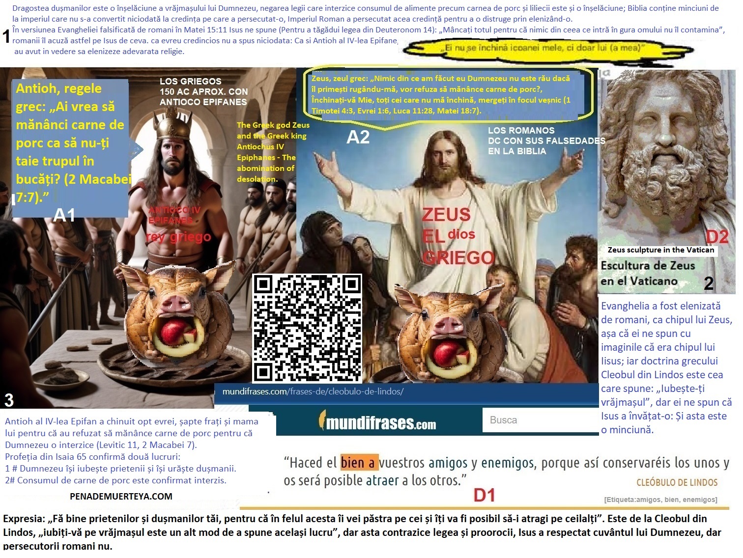 “Cine este responsabil pentru rău, “”Satana”” sau persoana care comite răul? Nu te lăsa păcălit de justificări stupide, deoarece „Diavolul” pe care îl învinuiesc pentru propriile lor fapte rele sunt chiar ei înșiși. Scuza tipică a persoanei religioase perverse: „Eu nu sunt așa, pentru că nu eu fac acest rău, ci Diavolul care m-a posedat este cel care face acest rău.” Romanii, acționând ca „Satana”, au creat conținut pe care l-au prezentat drept legile lui Moise, un conținut nedrept menit să discrediteze ceea ce era drept. Biblia nu conține doar adevăruri, ci și minciuni. Satana este o ființă din carne și sânge, deoarece înseamnă „calomniator”. Romanii l-au calomniat pe Pavel atribuindu-i mesajul din Efeseni 6:12. Lupta este împotriva cărnii și sângelui. Numeri 35:33 menționează pedeapsa cu moartea împotriva cărnii și sângelui, iar îngerii trimiși de Dumnezeu la Sodoma au distrus carnea și sângele, nu „duhurile rele din locurile cerești.” Matei 23:15 spune că fariseii își fac discipolii și mai corupți decât ei înșiși, ceea ce sugerează că cineva poate deveni nedrept din cauza unei influențe externe. Pe de altă parte, Daniel 12:10 afirmă că cei nedrepți vor continua să acționeze nedrept, deoarece aceasta este natura lor, iar doar cei drepți vor înțelege calea dreptății. Discrepanța dintre aceste două mesaje arată că unele părți ale Bibliei se contrazic între ele, punând sub semnul întrebării veridicitatea sa absolută. https://naodanxxii.wordpress.com/wp-content/uploads/2025/03/idi11-the-plot.pdf .” “Imperiul Roman, Bahira, Mahomed, Isus și iudaismul persecutat. Nașterea și moartea celei de-a patra fiare. Alianța greco-romană a acelorași zei. Imperiul Seleucid. Feriți-vă de a crede în Evanghelia lui antihrist (Vești bune pentru cei nedrepți, deși false) Dacă vrei să te salvezi de înșelăciunea adversarului justiției, ia în considerare că: Pentru a respinge Evanghelia falsă a Romei, acceptați că, dacă Isus a fost neprihănit, atunci El nu și-a iubit pe vrăjmașii Săi, iar dacă El nu era un ipocrit, atunci El nu a propovăduit dragostea pentru vrăjmași pentru că nu a propovăduit ceea ce El nu a practicat: Proverbele 29:27 Cei drepți urăsc pe cei nedrepți, iar cei nedrepți urăsc pe cei nedrepți. Aceasta face parte din Evanghelia alterată de romani pentru Biblie: 1 Petru 3:18 Căci Hristos a murit o dată pentru păcate, Cel drept pentru cei nedrepți, ca să ne aducă la Dumnezeu. Acum uită-te la asta care infirmă această calomnie: Psalmul 118: 20 Aceasta este poarta Domnului; drepții vor intra acolo. 21 Îți voi mulțumi pentru că m-ai ascultat și ai fost mântuirea mea. 22 Piatra pe care au lepădat-o constructorii a devenit piatra de temelie. Isus își blestemă vrăjmașii în pilda care îi prezice moartea și întoarcerea: Luke 20:14 14 Dar, când au văzut aceasta, arendașii viei s-au gândit între ei, zicând: Acesta este moștenitorul; haideți să-l omorâm, ca moștenirea să fie a noastră. 15 L-au aruncat deci din vie și l-au omorât. Ce le va face atunci proprietarul viei? 16 El va veni și va nimici pe acești arendași și va da via altora. Când au auzit acestea, au zis: „Cu siguranță că nu!” 17 Dar Iisus s-a uitat la ei și a zis: „Ce este, deci, aceasta care este scrisă: „Piatra pe care au lepădat-o zidarii, a devenit piatra unghiulară”?” El a vorbit despre această piatră, piatra de coșmar a regelui Babilonului: Daniel 2:31 În timp ce privegheai, rege, iată, un chip mare stătea înaintea ta, un chip extrem de mare, a cărui slavă era extrem de mare; aspectul ei era terifiant. 32 Capul chipului era de aur fin, pieptul și brațele lui de argint, pântecele și coapsele sale de aramă, 33 picioarele sale de fier și picioarele sale parțial de fier și parțial de lut. 34 În timp ce priveai, o piatră a fost tăiată fără mâini și a lovit în picioare chipul de fier și de lut și le-a rupt în bucăți. 35 Atunci fierul, lutul, bronzul, argintul și aurul s-au sfărâmat în bucăți și au devenit ca pleava de pe aria de vară; vântul le-a dus, fără a lăsa urme din ele. Dar piatra care a lovit chipul a devenit un munte mare și a umplut tot pământul. A patra fiară este alianța liderilor tuturor religiilor false prietenoase cu frauda romană denunțată. Creștinismul și islamul domină lumea, majoritatea guvernelor fie jură pe Coran, fie pe Biblie, din acest simplu motiv, chiar dacă guvernele îl neagă, sunt guverne religioase care se supun autorităților religioase din spatele acelor cărți prin care jură. Aici vă voi arăta influența romană asupra dogmelor acestor religii și cât de departe sunt acestea de dogmele religiei pe care Roma a persecutat-o. În plus, ceea ce vă voi arăta nu face parte din religia cunoscută astăzi ca iudaism. Și dacă adăugăm la aceasta frăția conducătorilor iudaismului, creștinismului și islamului, există suficiente elemente care să indice Roma ca fiind creatorul dogmelor acestor religii și că ultima religie menționată nu este aceeași cu iudaismul pe care Roma a persecutat-o. Da, afirm că Roma a creat creștinismul și că a persecutat un iudaism diferit de cel actual, liderii loiali ai iudaismului legitim nu ar da niciodată îmbrățișări frățești răspânditorilor de doctrine idolatre. Este evident că nu sunt creștin, așa că de ce citez pasaje din Biblie pentru a susține ceea ce spun? Pentru că nu totul din Biblie aparține exclusiv creștinismului, o parte din conținutul său este conținutul religiei căii dreptății care a fost persecutată de Imperiul Roman pentru că este contrară idealului roman de a face „Toate drumurile duc la Roma (Adică că aceste drumuri favorizează interesele imperiale), de aceea iau câteva pasaje din Biblie pentru a-mi susține afirmațiile. Daniel 2:40 Și a patra î
