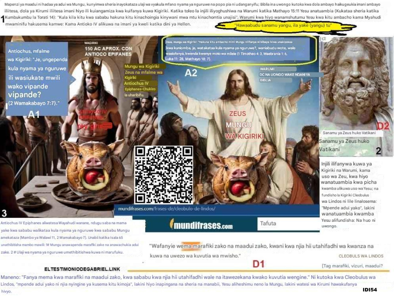 Sanamu ya Kigiriki ya Kristo na watakatifu—iliyoongozwa na Zeus na Cupid—inaonyesha ujumbe wa Biblia uliopotoka uliochochewa na uvutano wa Kigiriki, unaochochewa na wageuzwa-imani Waroma. Kutokana na hayo kunatoka uwongo unaounga mkono Ugiriki unaopatikana katika Biblia.