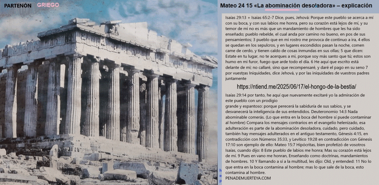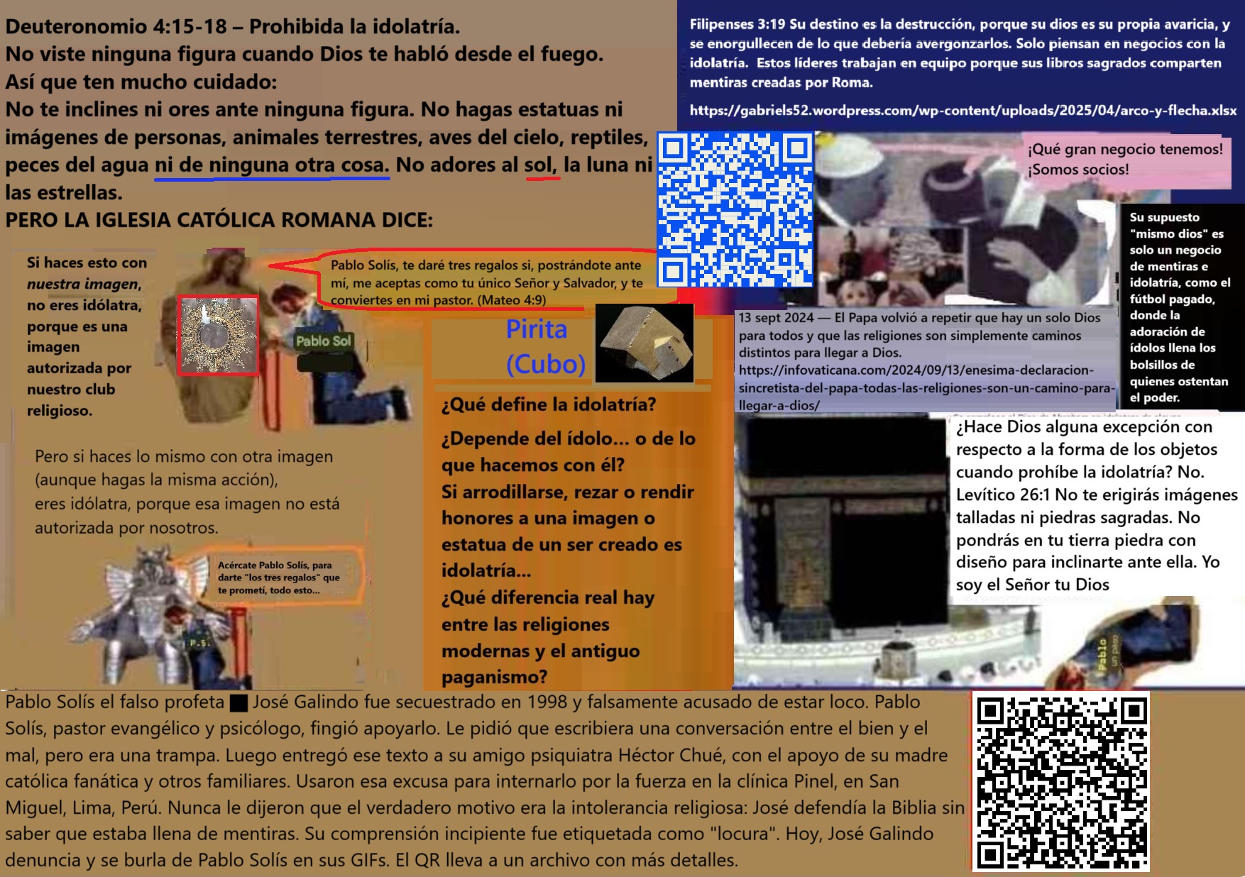 “El imperio Romano, Bahira, Mahoma, Jesús y el judaísmo perseguido. El nacimiento y la muerte de cuarta bestia. La alianza greco-romana por los mismos dioses. El Imperio seléucida. Cuidado con creer en el evangelio del anticristo (Buenas noticias para los injustos, aunque falsas) Si quieres salvarte del engaño del adversario de la justicia, considera que: Para rechazar el falso evangelio de Roma, acepte que si Jesús fue justo entonces no amó a sus enemigos, y si no fue hipócrita entonces no predicó el amor a los enemigos porque no predicaba lo que no practicaba: Proverbios 29:27 Los justos odian a los injustos, y los injustos odian a los justos. Esto es parte del evangelio adulterado por los romanos para la Biblia: 1 Pedro 3:18 Porque Cristo murió una vez por los pecados, el justo por los injustos, para llevarnos a Dios. Ahora mire esto que desmiente esa calumnia: Salmo 118:20 Esta es la puerta de Jehová; los justos entrarán por ella. 21 Te daré gracias porque me has escuchado y has sido mi salvación. 22 La piedra que rechazaron los constructores se ha convertido en la piedra angular. Jesús maldice a sus enemigos en la parábola que predice su muerte y regreso: Lucas 20:14 Pero cuando los viñadores vieron esto, discutieron entre sí, diciendo: Éste es el heredero; Venid, matémoslo, para que la herencia sea nuestra. 15 Entonces lo echaron de la viña y lo mataron. ¿Qué les hará entonces el dueño de la viña? 16 Él vendrá y destruirá a estos viñadores y dará la viña a otros. Cuando lo oyeron, dijeron: ¡De ninguna manera! 17 Pero Jesús, mirándolos, dijo: ¿Qué, pues, es esto que está escrito: La piedra que desecharon los constructores se ha convertido en la piedra angular? Él habló de esta piedra, de la piedra de la pesadilla del rey de Babilonia: Daniel 2:31 Tú, oh rey, veías, y he aquí una gran imagen. Esta imagen, que era muy grande, y cuya gloria era muy sublime, estaba en pie delante de ti, y su aspecto era terrible. 32 La cabeza de esta imagen era de oro fino; su pecho y sus brazos, de plata; su vientre y sus muslos, de bronce; 33 sus piernas, de hierro; sus pies, en parte de hierro y en parte de barro cocido. 34 Estabas mirando, hasta que una piedra fue cortada, no con mano, e hirió a la imagen en sus pies de hierro y de barro cocido, y los desmenuzó. 35 Entonces fueron desmenuzados también el hierro, el barro cocido, el bronce, la plata y el oro, y fueron como tamo de las eras del verano, y se los llevó el viento sin que de ellos quedara rastro alguno. Mas la piedra que hirió a la imagen fue hecha un gran monte que llenó toda la tierra. La cuarta bestia es la alianza de los líderes de todas las falsas religiones amigables con el fraude romano denunciado. El Cristianismo y el Islam dominan el mundo, la mayoría de los gobiernos o juran por el Corán o por la Biblia, por ese simple motivo, aunque los gobiernos lo nieguen, son gobiernos religiosos que se someten a las autoridades religiosas que están detrás de esos libros por los cuales juraron. Aquí les voy a mostrar la influencia romana en los dogmas de estas religiones y como distan mucho de los dogmas de la religión que perseguía Roma, Además, lo que les voy a mostrar no es parte de la religión que hoy se conoce como Judaísmo. Y si a esto le sumamos la fraternidad de los líderes del Judaísmo, Cristianismo e Islam, hay suficientes elementos para señalar a Roma como la creadora de los dogmas de estas religiones, y que la última religión mencionada no es la misma que el Judaísmo que perseguía Roma. Sí, estoy afirmando que Roma creó el cristianismo y que persiguió un Judaísmo diferente al actual, los líderes leales del Judaísmo legítimo jamás darían abrazos fraternales a difusores de doctrinas idólatras. Es evidente que no soy cristiano, ¿entonces porque cito pasajes de la Biblia para dar sustento a lo que digo?, pues porque no todo en la Biblia pertenece exclusivamente al cristianismo, parte de su contenido es el contenido de la religión del camino de la justicia que fue perseguido por el imperio romano por ser contrario al ideal romano de hacer que «Todos los caminos conduzcan a Roma (Es decir, que esos caminos favorezcan los intereses imperiales), por eso tomo algunos pasajes de la Biblia para sustentar mis afirmaciones. Daniel 2:40 Y el cuarto reino será fuerte como hierro; y como el hierro desmenuza y rompe todas las cosas, desmenuzará y quebrantará todo. 41 Y lo que viste de los pies y los dedos, en parte de barro cocido de alfarero y en parte de hierro, será un reino dividido; mas habrá en él algo de la fuerza del hierro, así como viste hierro mezclado con barro cocido. 42 Y por ser los dedos de los pies en parte de hierro y en parte de barro cocido, el reino será en parte fuerte, y en parte frágil. 43 Así como viste el hierro mezclado con barro, se mezclarán por medio de alianzas humanas; pero no se unirán el uno con el otro, como el hierro no se mezcla con el barro. 44 Y en los días de estos reyes el Dios del cielo levantará un reino que no será jamás destruido, ni será el reino dejado a otro pueblo; desmenuzará y consumirá a todos estos reinos, pero él permanecerá para siempre. El cuarto reino es el reino de las falsas religiones. Por eso a los Papas en el Vaticano le dan honores los dignatarios de países como Estados Unidos. El país líder en el mundo no es EEUU, no es la bandera de los Estados Unidos la que ondea en las plazas de armas de las capitales de varios países de Latino América, es la bandera del Vaticano la que ondea. Los Papas se reúnen con los líderes de otras religiones dominantes, cosa imposible de imaginar entre profetas y falsos profetas. Pero entre falsos profetas estas alianzas son posibles. La piedra angular es la justicia. Los romanos no sólo despreciaban el hecho de que fuera un hombre justo, sino también el hecho de que él merecía casarse con una mujer justa: 1 Corintios 11:7 La mujer es la gloria d