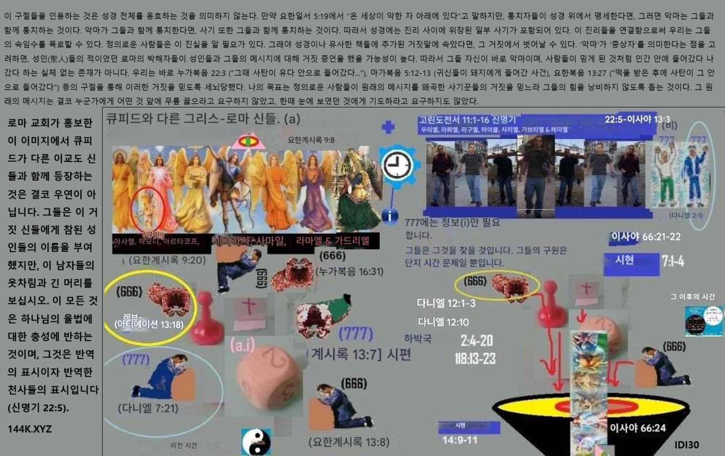 나는 과거에 무지로 인해 성경의 믿음을 변호하려 했던 실수를 저질렀다. 하지만 이제는 확실히 이해한다. 성경은 로마가 박해한 종교의 책이 아니라, 로마 자체가 만든 책이며, 독신주의를 찬양하는 종교를 위한 것이다. 그렇기 때문에 그들은 그리스도가 여성과 결혼하는 것이 아니라 ‘교회’와 결혼한다고 가르치며, 천사들이 남성의 이름을 가지고 있지만 남성의 모습이 아닌 것으로 묘사한다(그 의미를 스스로 생각해 보라). 그들이 묘사하는 모습들은 석고상에 입을 맞추는 거짓 성인들과 마찬가지로, 그리스-로마 신들과 유사하다. 왜냐하면 사실 그것들은 이름만 바꾼 이교도의 신들일 뿐이기 때문이다.