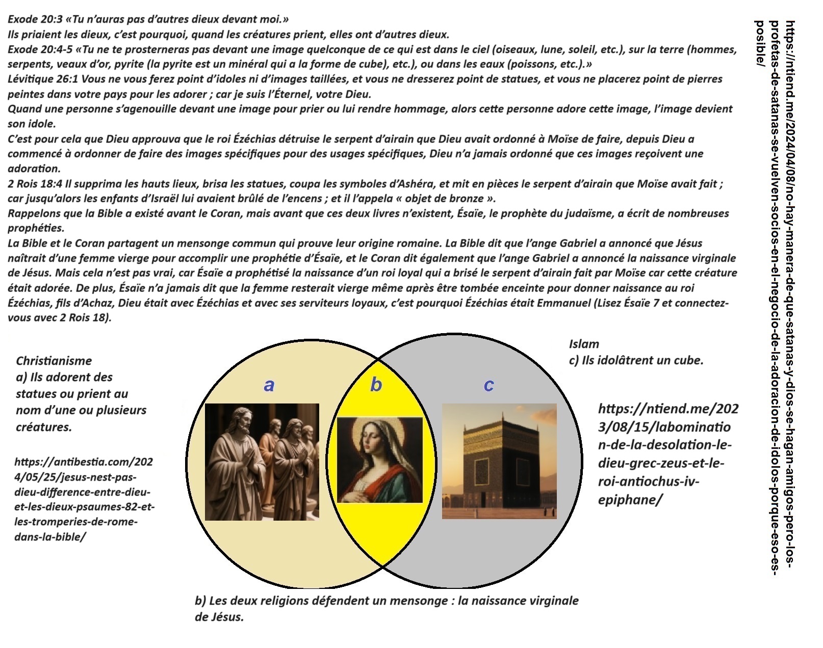“L’Empire romain, Bahira, Mahomet, Jésus et le judaïsme persécuté. La naissance et la mort de la quatrième bête. L’alliance gréco-romaine par les mêmes dieux. L’Empire Séleucide. Méfiez-vous de croire à l’évangile de l’antéchrist (Bonne nouvelle pour les injustes, bien que fausse) Si vous voulez vous sauver de la tromperie de l’adversaire de la justice, considérez que : Pour rejeter le faux évangile de Rome, acceptez que si Jésus était juste, alors il n’aimait pas ses ennemis, et s’il n’était pas un hypocrite, alors il n’a pas prêché l’amour des ennemis parce qu’il n’a pas prêché ce qu’il n’a pas pratiqué : Proverbes 29: 27 Le juste haït l’injuste, et l’injuste haït le juste. Ceci fait partie de l’évangile adultéré par les Romains pour la Bible : 1 Pierre 3:18 Car Christ est mort une fois pour les péchés, lui juste pour des injustes, afin de nous amener à Dieu. Maintenant, regardez ceci qui réfute cette calomnie : Psaumes 118: 20 C’est ici la porte de l’Éternel; les justes y entreront. 21 Je te rends grâces parce que tu m’as exaucé et que tu as été mon salut. 22 La pierre que les bâtisseurs ont rejetée est devenue la pierre angulaire. Jésus maudit ses ennemis dans la parabole qui prédit sa mort et son retour : Luc 20:14 Quand les vignerons virent cela, ils raisonnèrent entre eux, et dirent: Celui-ci est l’héritier; Venez, tuons-le, afin que l’héritage soit à nous. 15 Alors ils le jetèrent hors de la vigne et le tuèrent. Que va-t-il leur faire alors, le propriétaire du vignoble ? 16 Il viendra, fera périr ces vignerons et donnera la vigne à d’autres. Lorsqu’ils entendirent cela, ils dirent : « Certainement pas ! » 17 Mais Jésus les regarda et dit : Que signifie donc ce qui est écrit : La pierre qu’ont rejetée ceux qui bâtissaient Est devenue la principale angulaire ? Il parla de cette pierre, la pierre du cauchemar du roi de Babylone : Daniel 2:31 Pendant que tu regardais, ô roi, voici, une grande statue se tenait devant toi, une statue extrêmement grande et magnifiquement magnifique. son apparence était terrifiante. 32 La tête de la statue était d’or pur, sa poitrine et ses bras d’argent, son ventre et ses cuisses d’airain, 33 ses jambes de fer, et ses pieds en partie de fer et en partie d’argile. 34 Pendant que vous regardiez, une pierre se détacha sans le secours d’aucune main, frappa les pieds de la statue de fer et d’argile, et les brisa. 35 Alors le fer, l’argile, l’airain, l’argent et l’or furent brisés et devinrent comme la balle qui s’échappe d’une aire en été; le vent les emporta, ne laissant aucune trace d’eux. Mais la pierre qui avait frappé la statue devint une grande montagne et remplit toute la terre. La quatrième bête est l’alliance des chefs de toutes les fausses religions amies de la fraude romaine dénoncée. Le christianisme et l’islam dominent le monde, la plupart des gouvernements jurent soit par le Coran soit par la Bible, pour cette simple raison, même si les gouvernements le nient, ce sont des gouvernements religieux qui se soumettent aux autorités religieuses derrière ces livres sur lesquels ils jurent. Ici, je vais vous montrer l’influence romaine sur les dogmes de ces religions et à quel point ils sont éloignés des dogmes de la religion que Rome a persécutée. De plus, ce que je vais vous montrer ne fait pas partie de la religion que l’on connaît aujourd’hui sous le nom de judaïsme. Et si l’on ajoute à cela la fraternité des dirigeants du judaïsme, du christianisme et de l’islam, il y a suffisamment d’éléments pour désigner Rome comme le créateur des dogmes de ces religions, et que la dernière religion mentionnée n’est pas la même que le judaïsme que Rome a persécuté. Oui, j’affirme que Rome a créé le christianisme et qu’elle a persécuté un judaïsme différent de celui actuel, les dirigeants loyaux du judaïsme légitime ne donneraient jamais d’embrassades fraternelles aux propagateurs de doctrines idolâtres. Il est évident que je ne suis pas chrétien, alors pourquoi est-ce que je cite des passages de la Bible pour étayer ce que je dis ? Parce que tout dans la Bible n’appartient pas exclusivement au christianisme, une partie de son contenu est le contenu de la religion du chemin de la justice qui a été persécutée par l’Empire romain pour être contraire à l’idéal romain de faire « Tous les chemins mènent à Rome (C’est-à-dire que ces chemins favorisent les intérêts impériaux), c’est pourquoi je prends quelques passages de la Bible pour étayer mes affirmations. Daniel 2:40 Le quatrième royaume sera fort comme du fer, et les cieux seront comme du fer. et comme le fer brise et brise toutes choses, ainsi il brisera et écrasera toutes choses. 41 Et ce que tu as vu des pieds et des orteils, en partie d’argile de potier et en partie de fer, sera un royaume divisé; et il y aura en elle de la force du fer, comme tu as vu du fer mêlé à de l’argile. 42 Et parce que les doigts des pieds étaient en partie de fer et en partie d’argile, le royaume sera en partie fort et en partie fragile. 43 De même que tu as vu le fer mêlé à l’argile, ainsi ils seront mêlés par des alliances humaines ; mais ils ne s’attacheront pas l’un à l’autre, comme le fer ne se mêle pas à l’argile. 44 Dans le temps de ces rois, le Dieu du ciel suscitera un royaume qui ne sera jamais détruit et qui ne passera point sous la domination d’un autre peuple, il brisera et anéantira tous ces royaumes-là, mais lui subsistera éternellement. Le quatrième royaume est le royaume des fausses religions. C’est pourquoi les papes au Vatican sont honorés par des dignitaires de pays comme les États-Unis. Le pays leader du monde n’est pas les États-Unis, ce n’est pas le drapeau des États-Unis qui flotte sur les places principales des capitales de diver