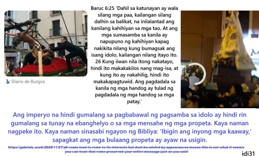 Ang imperyo na hindi gumalang sa pagbabawal ng pagsamba sa idolo ay hindi rin gumalang sa tunay na ebanghelyo o sa mga mensahe ng mga propeta. Kaya naman nagpeke ito. Kaya naman sinasabi ngayon ng Bibliya: ‘Ibigin ang inyong mga kaaway,’ sapagkat ang mga bulaang propeta ay ayaw na usigin.
