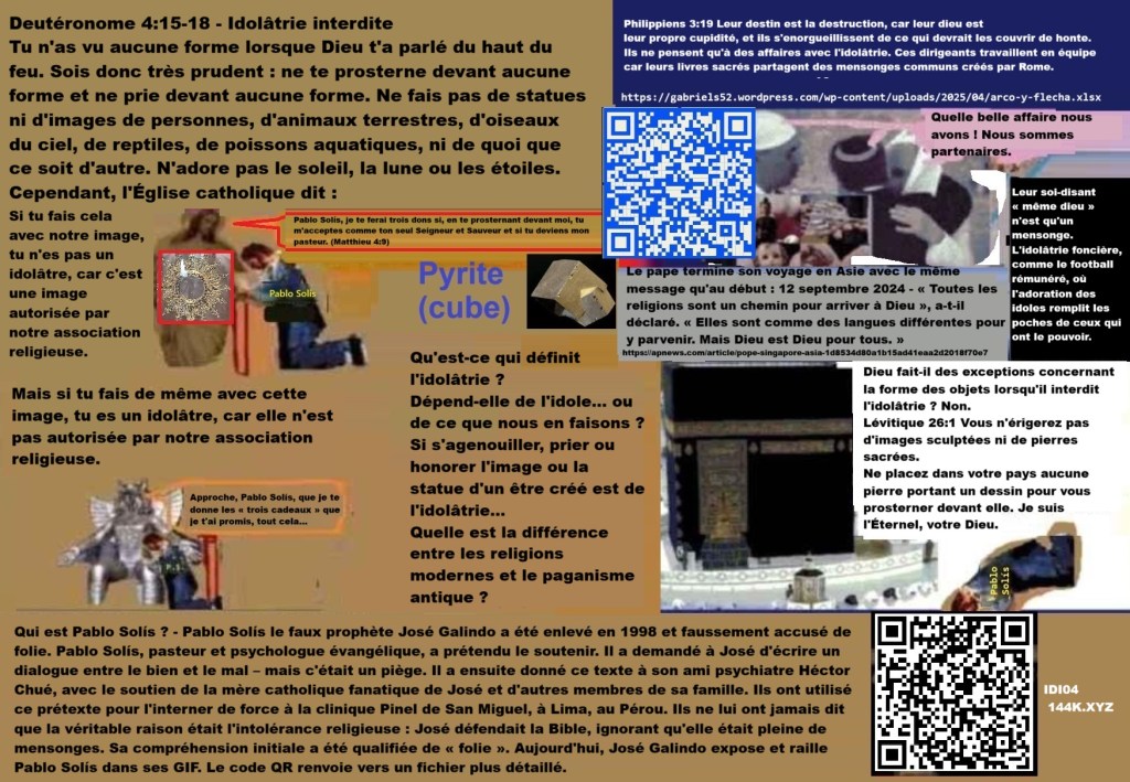 https://itwillbedotme.wordpress.com/wp-content/uploads/2025/03/idi04-elle-me-trouvera-la-femme-vierge-me-croira.docx Elle me trouvera, la femme vierge me croira. ( https://ellameencontrara.com – https://lavirgenmecreera.com – https://shewillfind.me ) Ceci est le blé dans la Bible qui détruit l’ivraie romaine dans la Bible : Apocalypse 19:11 Puis je vis le ciel ouvert, et voici un cheval blanc; celui qui le montait s’appelait Fidèle et Véritable, et c’est avec justice qu’il juge et fait la guerre. Apocalypse 19:19 Et je vis la bête, les rois de la terre et leurs armées rassemblés pour faire la guerre à celui qui était assis sur le cheval et à son armée. Psaume 2:2-4 “”Les rois de la terre se dressent, et les princes conspirent ensemble contre le Seigneur et contre son oint, en disant: ‘Brisons leurs liens et rejetons loin de nous leurs chaînes.’ Celui qui siège dans les cieux rit; le Seigneur se moque d’eux.”” Maintenant, un peu de logique élémentaire: si le cavalier se bat pour la justice, mais que la bête et les rois de la terre combattent contre ce cavalier, alors la bête et les rois de la terre sont contre la justice. Par conséquent, ils représentent la tromperie des fausses religions qui gouvernent avec eux. La grande prostituée de Babylone, qui est la fausse église créée par Rome, s’est considérée comme “”l’épouse de l’oint du Seigneur””, mais les faux prophètes de cette organisation qui vend des idoles et des paroles flatteuses ne partagent pas les objectifs personnels de l’oint du Seigneur et des vrais saints, car les dirigeants impies ont choisi pour eux-mêmes la voie de l’idolâtrie, du célibat ou de la sacralisation des mariages impurs en échange d’argent. Leurs sièges religieux sont remplis d’idoles, y compris de faux livres saints, devant lesquels ils se prosternent: Ésaïe 2:8-11 8 Leur pays est rempli d’idoles; ils se prosternent devant l’œuvre de leurs mains, devant ce que leurs doigts ont fabriqué. 9 L’homme est abaissé, et le mortel est humilié; ne leur pardonne pas. 10 Entre dans le rocher, cache-toi dans la poussière, devant la terreur du SEIGNEUR et la splendeur de sa majesté. 11 L’orgueil des hommes sera abaissé, et l’arrogance des hommes sera humiliée; seul le SEIGNEUR sera exalté en ce jour-là. Proverbes 19:14 Maison et richesses sont un héritage des pères, mais une femme prudente vient du SEIGNEUR. Lévitique 21:14 Le prêtre du SEIGNEUR ne prendra pas pour épouse une veuve, ni une divorcée, ni une femme impure, ni une prostituée; il prendra pour épouse une vierge de son propre peuple. Apocalypse 1:6 Et il a fait de nous des rois et des prêtres pour son Dieu et Père; à lui soient la gloire et la domination aux siècles des siècles. 1 Corinthiens 11:7 La femme est la gloire de l’homme. Que signifie dans l’Apocalypse que la bête et les rois de la terre font la guerre au cavalier du cheval blanc et à son armée ? Le sens est clair, les dirigeants du monde sont de mèche avec les faux prophètes qui sont les diffuseurs des fausses religions qui dominent parmi les royaumes de la terre, pour des raisons évidentes, qui incluent le christianisme, l’islam, etc. Ces dirigeants sont contre la justice et la vérité, qui sont les valeurs défendues par le cavalier du cheval blanc et son armée fidèle à Dieu. Comme il est évident, la tromperie fait partie des faux livres sacrés que ces complices défendent avec l’étiquette de « Livres autorisés des religions autorisées », mais la seule religion que je défends est la justice, je défends le droit des justes à ne pas se laisser tromper par les tromperies religieuses. Apocalypse 19:19 Puis je vis la bête et les rois de la terre et leurs armées rassemblés pour faire la guerre au cavalier du cheval et à son armée. Maintenant, un peu de logique de base, si le cavalier représente la justice, mais que la bête et les rois de la terre combattent ce cavalier, alors la bête et les rois de la terre sont contre la justice, par conséquent ils représentent la tromperie des fausses religions qui règnent avec eux.Un duro golpe de realidad es a «Babilonia» la «resurrección» de los justos, que es a su vez la reencarnación de Israel en el tercer milenio: La verdad no destruye a todos, la verdad no duele a todos, la verdad no incomoda a todos: Israel, la verdad, nada más que la verdad, la verdad que duele, la verdad que incomoda, verdades que duelen, verdades que atormentan, verdades que destruyen.C’est mon histoire: José, un jeune homme élevé dans les enseignements catholiques, a vécu une série d’événements marqués par des relations complexes et des manipulations. À 19 ans, il entame une relation avec Monica, une femme possessive et jalouse. Bien que José ait estimé qu’il devait mettre un terme à cette relation, son éducation religieuse l’a conduit à essayer de la changer par l’amour. Cependant, la jalousie de Monica s’est intensifiée, en particulier envers Sandra, une camarade de classe qui faisait des avances à José. Sandra a commencé à le harceler en 1995 avec des appels téléphoniques anonymes, au cours desquels elle faisait des bruits avec le clavier et raccrochait.