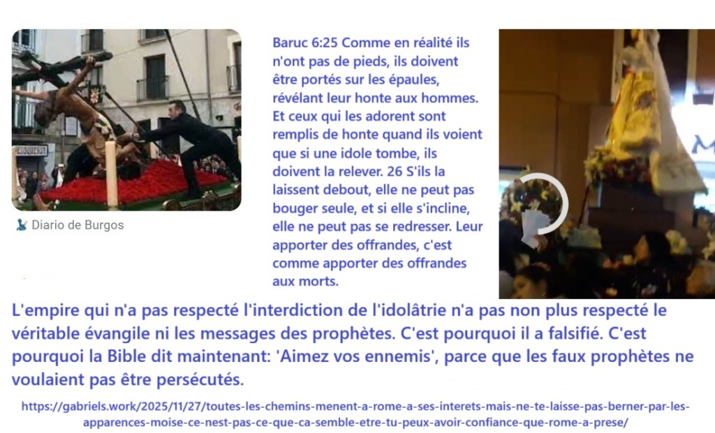 Baruc 6:25 Comme en réalité ils n’ont pas de pieds, ils doivent être portés sur les épaules, révélant leur honte aux hommes. Et ceux qui les adorent sont remplis de honte quand ils voient que si une idole tombe, ils doivent la relever. 26 S’ils la laissent debout, elle ne peut pas bouger seule, et si elle s’incline, elle ne peut pas se redresser. Leur apporter des offrandes, c’est comme apporter des offrandes aux morts. L’empire qui n’a pas respecté l’interdiction de l’idolâtrie n’a pas non plus respecté le véritable évangile ni les messages des prophètes. C’est pourquoi il a falsifié. C’est pourquoi la Bible dit maintenant: ‘Aimez vos ennemis’, parce que les faux prophètes ne voulaient pas être persécutés.
