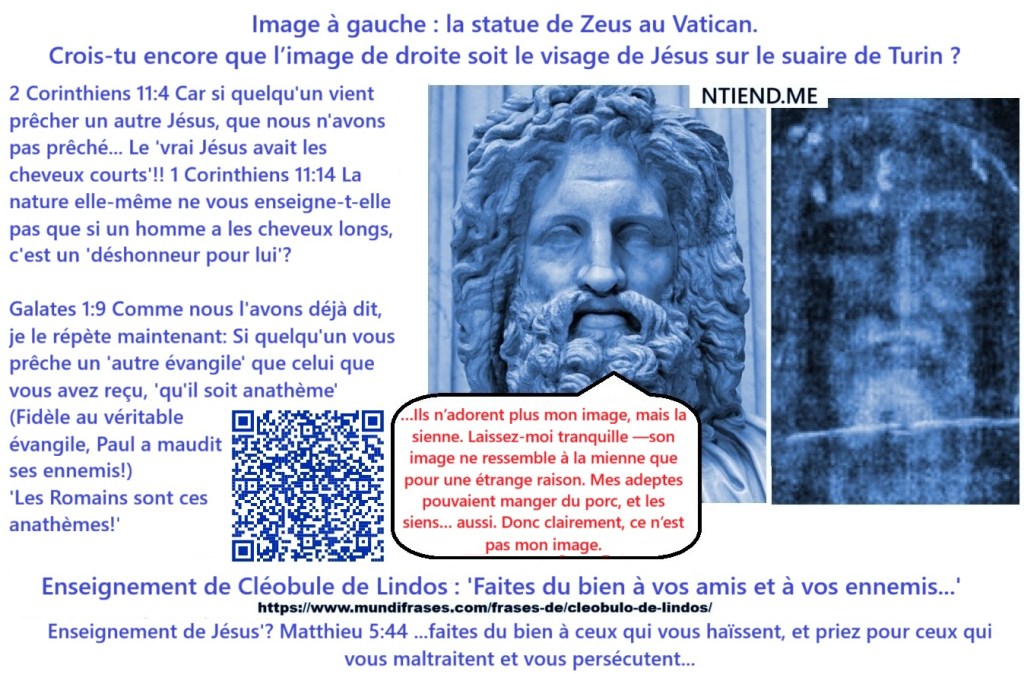 Zeus dit : ‘…Ils n’adorent plus mon image, mais la sienne. Laissez-moi tranquille —son image ne ressemble à la mienne que pour une étrange raison. Mes adeptes pouvaient manger du porc, et les siens… aussi. Donc clairement, ce n’est pas mon image.’