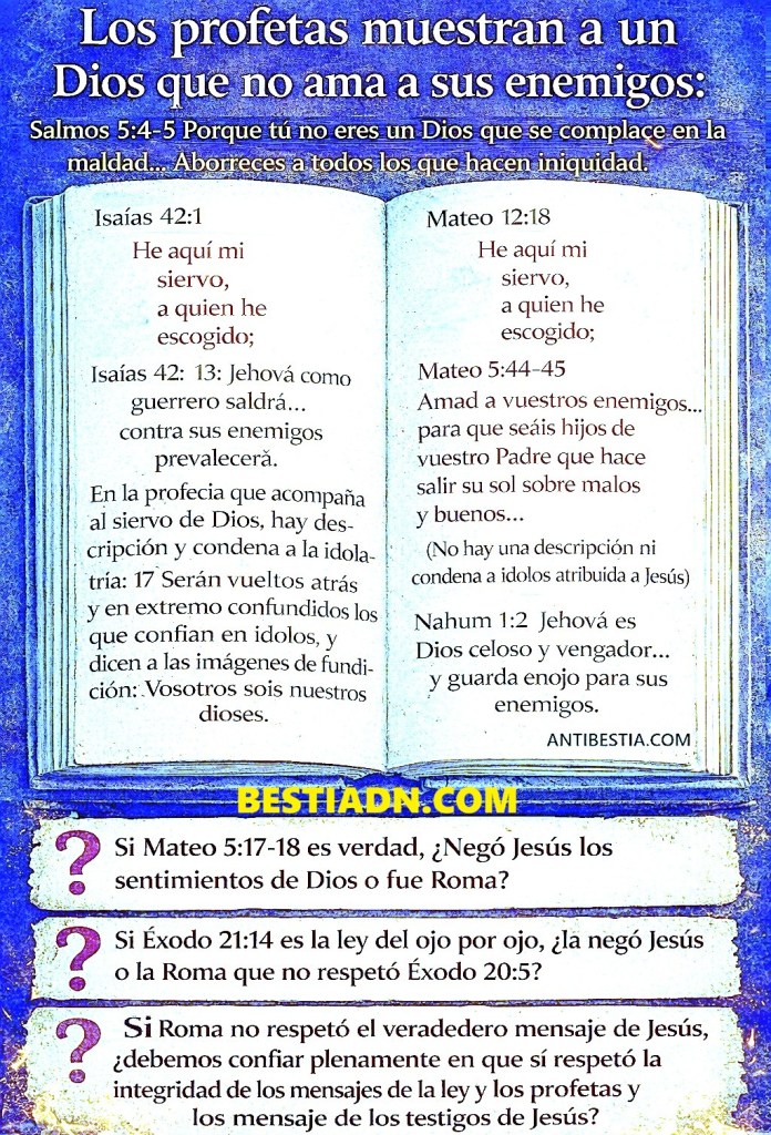 Proverbios 1:8 ¿No clama la sabiduría, Y da su voz la inteligencia? ¿Por qué entonces Eclesiastés dice “No seas sabio en exceso”? Porque Roma, la que hizo un pacto con la muerte, adulteró, escondió y canonizo mentiras de ella para la Biblia en sus corruptos concilos, por eso las palabras justas en la Biblia están con conflicto con las palabras injustas. Proverbios 8:36 Pero el que peca contra mí, a sí mismo se daña; todos los que me odian, aman la muerte. Palabras contra Roma, la que gobernó sobre Jerusalén y jamás se convirtió a su fe, jamás: https://www.youtube.com/shorts/Ye61Bnk4t5Y?feature=share Isaías 28:14 Por tanto, varones burladores que gobernáis a este pueblo que está en Jerusalén, oíd la palabra de Jehová. 15 Por cuanto habéis dicho: Pacto tenemos hecho con la muerte, e hicimos convenio con el Seol; cuando pase el turbión del azote, no llegará a nosotros, porque hemos puesto nuestro refugio en la mentira, y en la falsedad nos esconderemos; 16 por tanto, Jehová el Señor dice así: He aquí que yo he puesto en Sion por fundamento una piedra, piedra probada, angular, preciosa, de cimiento estable; el que creyere, no se apresure. 17 Y ajustaré el juicio a cordel, y a nivel la justicia; y granizo barrerá el refugio de la mentira, y aguas arrollarán el escondrijo. 18 Y será anulado vuestro pacto con la muerte, y vuestro convenio con el Seol no será firme; cuando pase el turbión del azote, seréis de él pisoteados. 19 Luego que comience a pasar, él os arrebatará; porque de mañana en mañana pasará, de día y de noche; y será ciertamente espanto el entender lo oído. Isaías 25:8 Destruirá a la muerte para siempre; y enjugará Jehová el Señor toda lágrima de todos los rostros; y quitará la afrenta de su pueblo de toda la tierra; porque Jehová lo ha dicho.